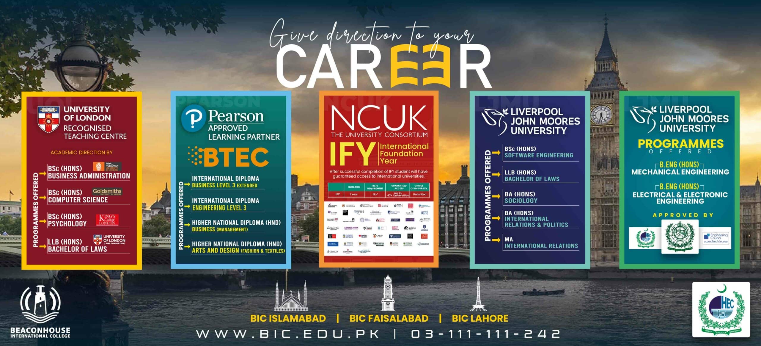 Beaconhouse International College emphasises on a student-centered approach to learning that fosters skills and values which allow our students to be successful contributors to the 21st century global economy and to Pakistan. Through our international degrees, our highly qualified faculty and staff, our state-of-the-art campuses and our comprehensive student support services, we ensure that you find your own path to success!